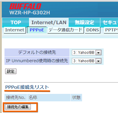 「PPPoE接続先リスト」の「接続先の編集」というボタンをクリックします。
