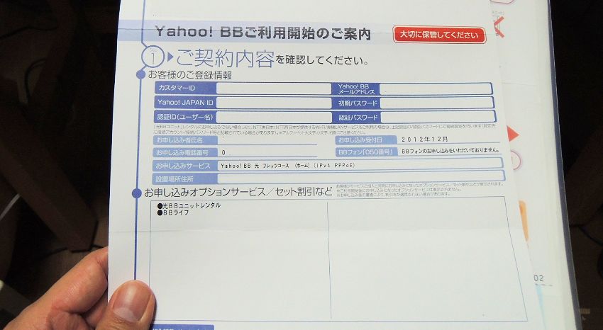まずは、Yahoo!BBから送られてきた封筒に入っている「Yahoo!BBご利用開始のご案内」の紙を用意します。