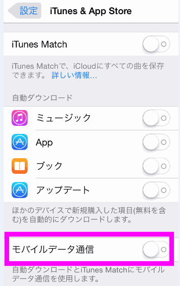 「自動ダウンロード」の下にある「モバイルデータ通信」をオフにします。これで、Wi-Fi以外では「音楽」「アプリ」「電子書籍」「アプリのアップデート」はバックグラウンドでダウンロードされません。