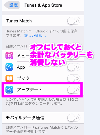 特に「アップデート」をオンにしておくと、バッテリーの消費も激しくなるので、Wi-Fiを使っている人も、ここはオフにしておくといいかも。