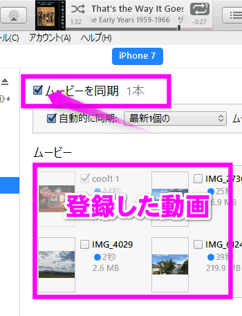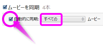 すべての登録した動画を同期させるには、「自動に同期」にチェックを入れ、「すべての」にしてください。