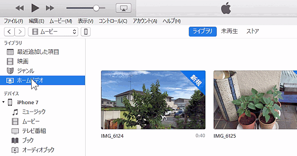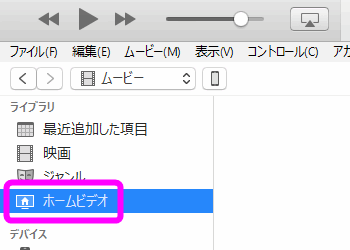 iTunesの左側の「ライブラリ」にある「ホームビデオ」をクリックして選択します。