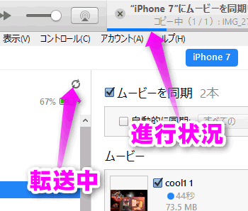 同期の進行状況は、iTunesの上部中央あたりに表示されます。