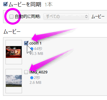 選択した動画だけを転送したい場合は、「自動的に同期」のチェックを外し、転送したい動画のみチェックを入れてください。