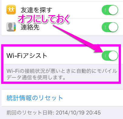 「Wi-Fiアシスト」とは、Wi-Fiの電波が弱い時に自動的にモバイルデータ通信とダブルで通信する機能で、デフォルトでオンになっています。