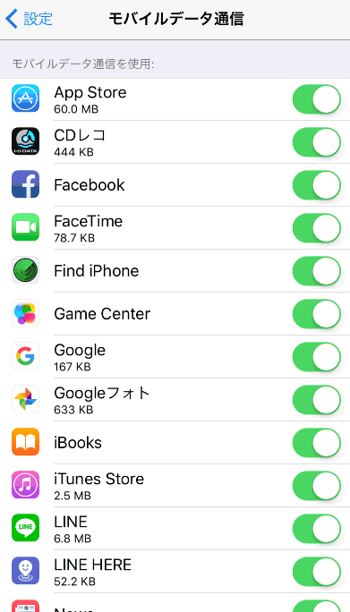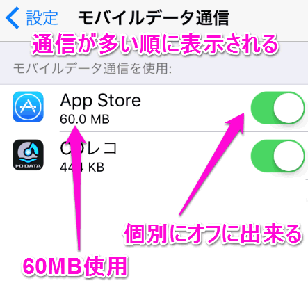 右のスイッチは、アプリごとに個別にデータ通信を出来るようにするか、のスイッチです。