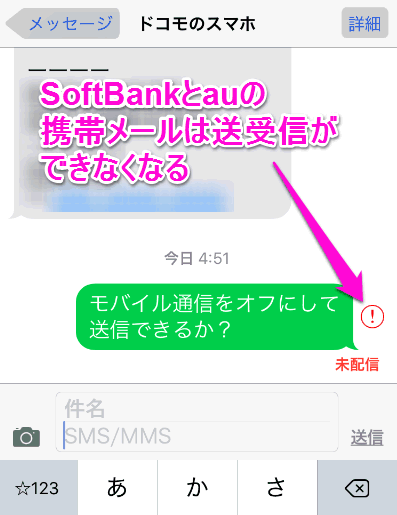 モバイルデータ通信をオフにすると、Wi-Fiに繋がっていてもSoftBankとauの携帯メール( @softbank.ne.jp と @ezweb.ne.jp )のように、