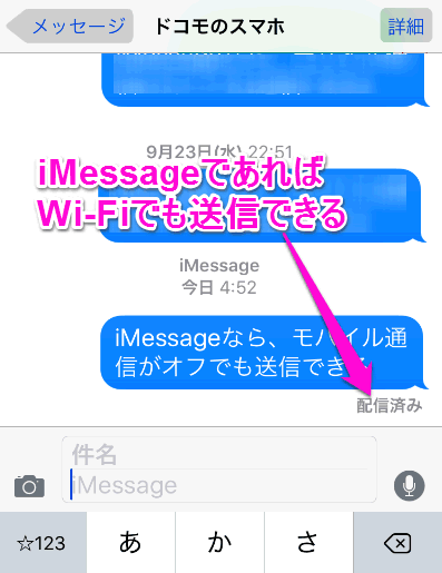 で送受信するのですが、iMessageが使える場合、このように青い吹き出しになります。