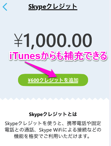 前払いは、Skypeクレジットと呼ばれるクレジットカードやコンビニで販売されているプリペイドカード、それからiTunesストアでの支払い(600円)など様々な支払い方法が選択できる機能で料金をチャージします。