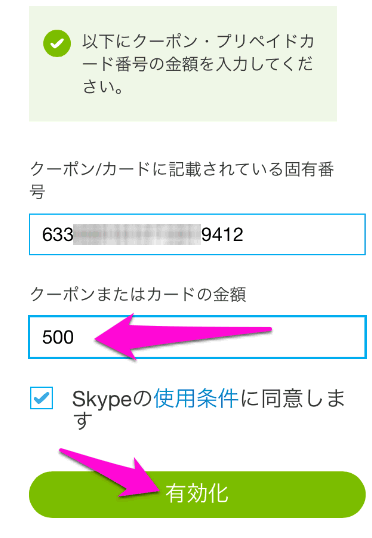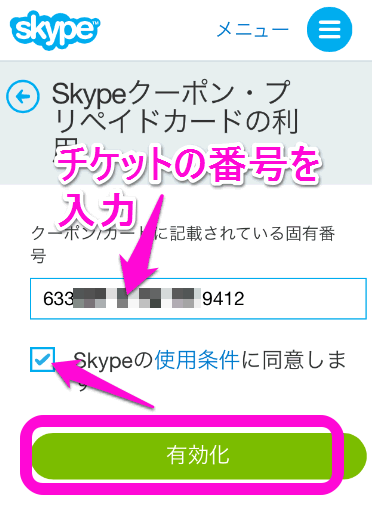チケットの番号を入力し、「Skypeの使用条件に同意します」にチェックを入れたら、「有効化」をタップ。
