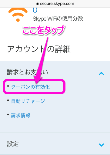 下の方にスクロールしていくと、「クーポンの有効化」という部分があるので、ここをタップします。