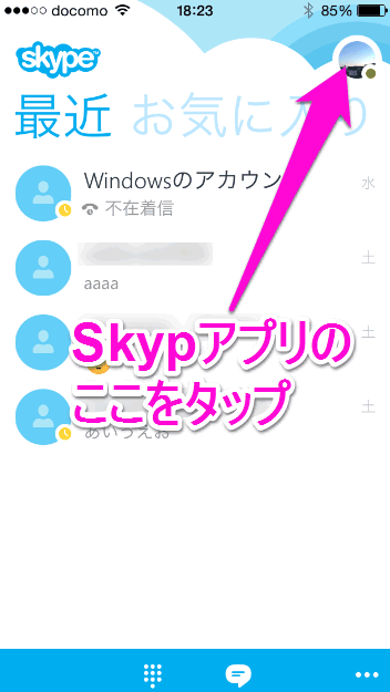 Skypeアプリを起動させたら、右上にある丸のプロフィール写真をタップします。
