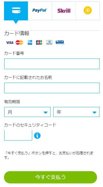 クレジットカードで支払う場合は、カード番号、カードに記載された名前(ローマ字)、有効期限、カードのセキュリティコードを入力して、「今すぐ支払う」をタップします。