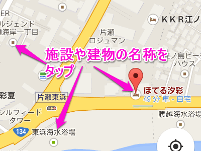 google Mapsと違い、タップし続けてもオレンジ色のフラッグが表示されないので、ストリートビューで表示させたい場所付近にある建物や施設のアイコンをタップします。