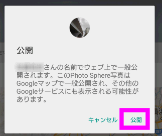 Googleマップで公開する場合は、このような注意書きが表示されるので「公開」をタップします。