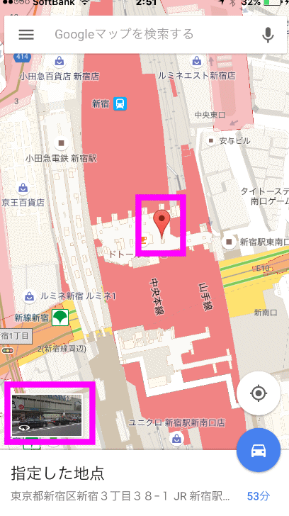 ピンが表示され、左下にその場所のストリートビューが表示されます。