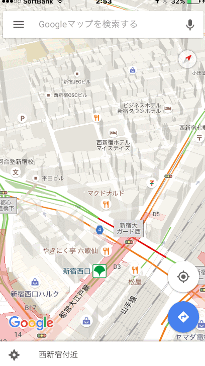 Googleマップの方は、二本の指で地図をなぞると、このように建物が立体的になります。