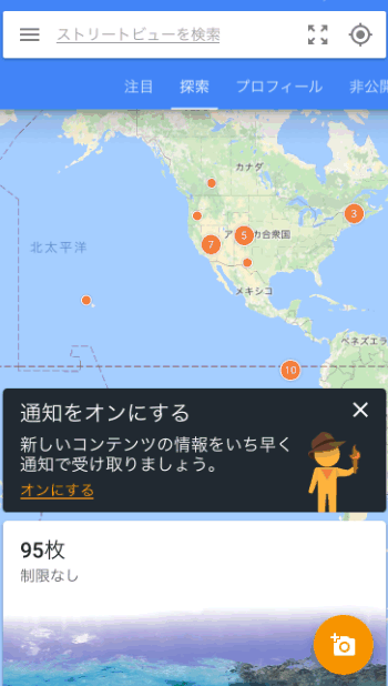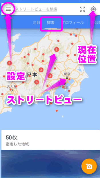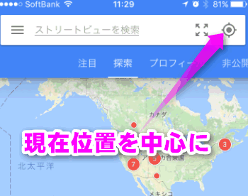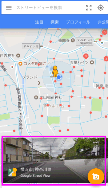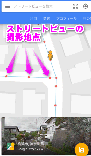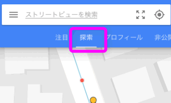 タップした地点のストリートビューを見たい場合は、「探索」タブを使います。