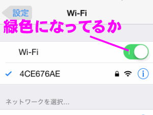 Wi-Fiがオン(緑色)になっているか確認します。なっていない場合は、オンにします。
