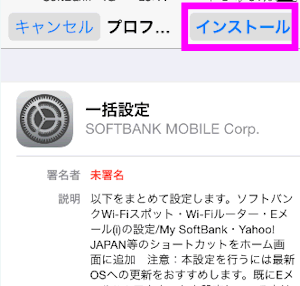 一括設定用のプロファイルが表示されるので、右上の「インストール」をタップします。