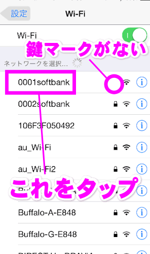 ソフトバンクWi-Fiスポットが使用できるエリアであれば、このように「0001softbank」という表示が現れるはずです。