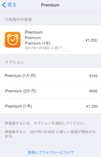 なお、たいていの有料アプリは一ヶ月ごとの更新より、1年間ごとの更新のほうが安いので、ここで1年間ごとの更新に変更することもできます。