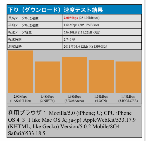 - 『iPhone 4S』の通信速度、auよりソフトバンクの方が速いのは確定的。実測値でauは1.45Mbpsに対しSBは2.02Mbps