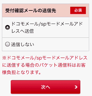 そのまま下へスクロールし、「ドコモメール/spモードメールアドレスへ送信」にチェックを入れ、「次へ」をタップします。