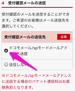 下にスクロールしていき、「ドコモメール/spモードメールアドレスへ送信」にチェックを入れます。