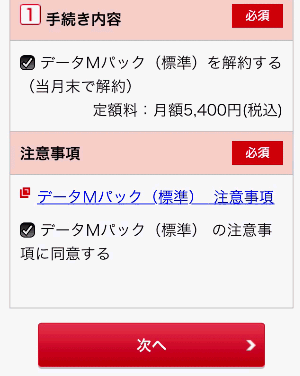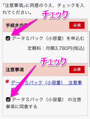 「~を申し込む」にチェックが入っていることを確認し、「データSパック(小容量)注意事項に同意する」のチェックを入れます。