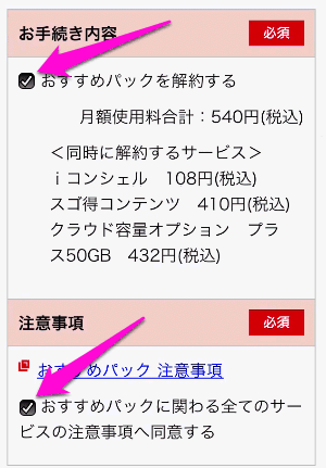 「おすすめパックを解約する」にチェックが入っていることを確認し、注意事項へ同意するにチェックを入れます。