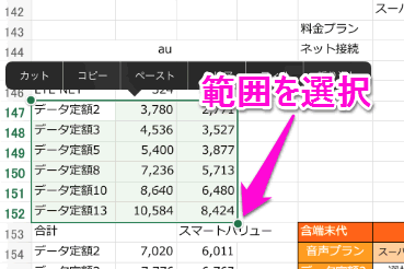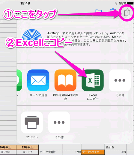 右上の丸で囲った部分をタップし、「Excelにコピー」をタップします。