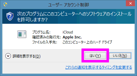 ユーザーアカウント制御の警告が表示されるので、「はい」をクリックします。