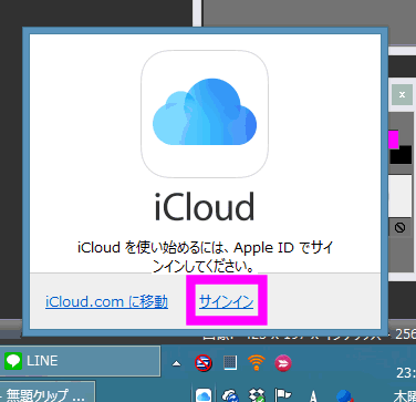 Windowsの時計の左横辺りにある雲のアイコンがiCloudになります。ここをクリックします。
