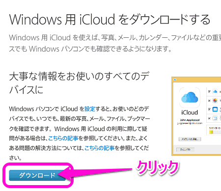 Windows用iCloudダウンロードページへ行き、「ダウンロード」をクリックします。