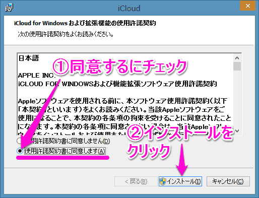 インストール用ウィザードが開始されるので、「使用許諾契約」を読み、「同意します」にチェックを入れ、「インストール」をクリックします。