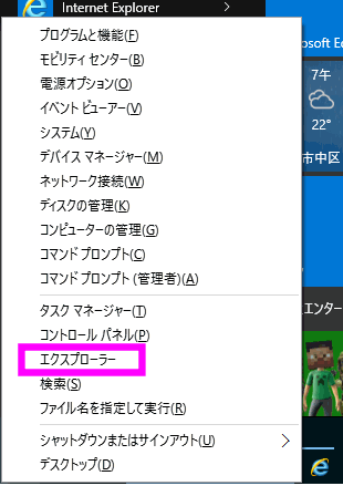 Windows8の場合は、「Windowsキー」と「Xキー」を同時に押して表示されるメニューから「エクスプローラー」を選択します。