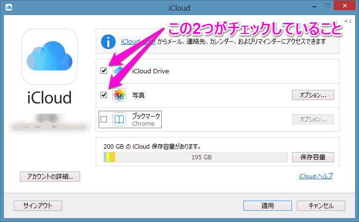 「iCloud Drive」にチェックが付いていることを確認し、「適用」をクリックします。