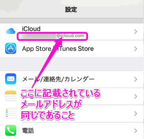 設定にある「iCloud」の下に表示されているメールアドレスです。