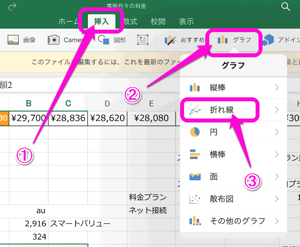 「挿入」をタップし、「グラフ」をタップ。