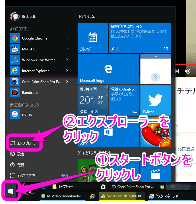 スタートボタンをクリックし、「エクスプローラー」をクリックします。