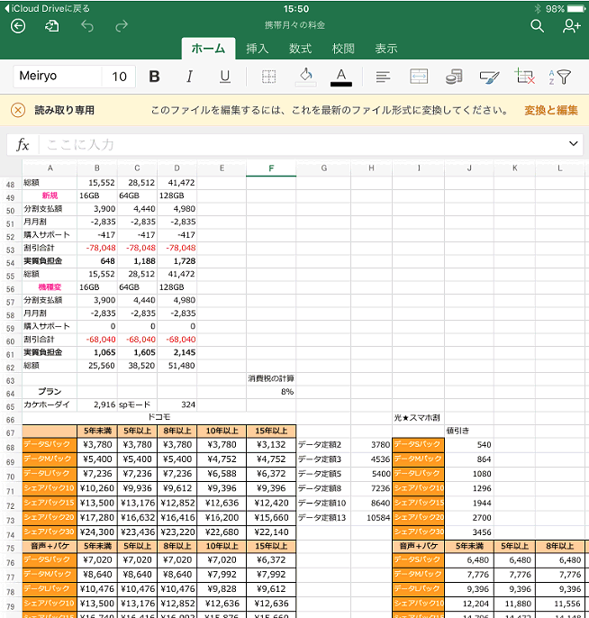 上の方に「読み取り専用 このファイルを編集するには、これを最新のファイル形式に変換してください。 変換と編集」という表示があります。