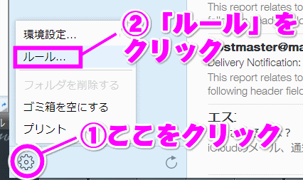 するとメニューが表示されるので、②「ルール...」をクリックしてください。