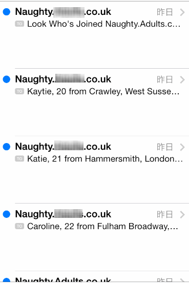 久々にメールを開いてみると、「Naughty.Adulte.co.uk」という差出人から大量のスパムメールが届いていました。