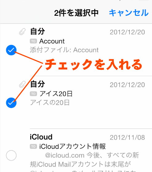 すると、メール1件1件の前にチェックボックスが出現するので、迷惑メールにチェックを入れます。