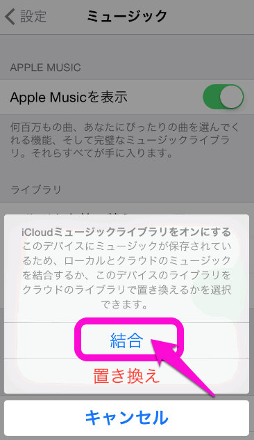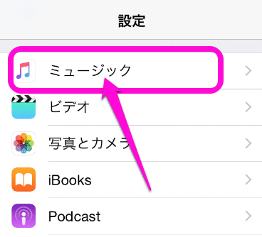 iCloudミュージックライブラリをオンにするには、以下。