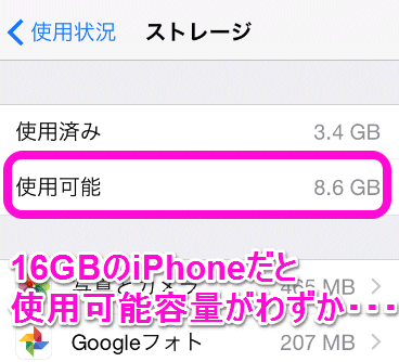 例えば16GBのiPhoneは、音楽を転送していなくても残りの使用可能容量は8.6GBほどしかありません。