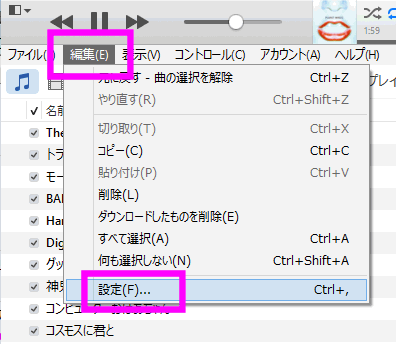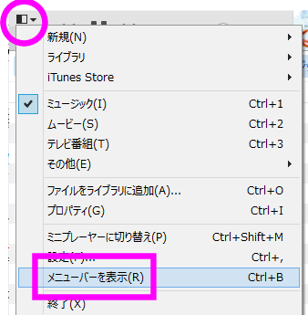 パソコンでiCloudミュージックライブラリを利用するには、iTunesを立ち上げ、左上の小さな三角の部分をクリックし、「メニューバーを表示」を選択します。