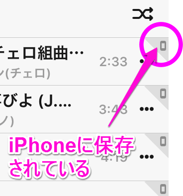 iPhoneやiPadに保存されている曲は、このように曲の右側に三角のアイコンが表示されます。