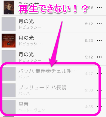 ところが、別のiPhone(16GBで曲を保存していない端末)では、この3曲が何故かグレー表示になって再生できなくなっていました。